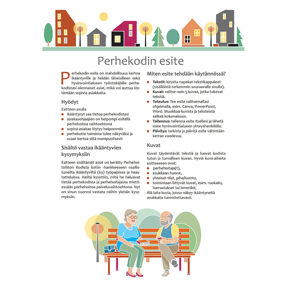 Perhekodin esite tarjoaa perhehoitajalle mahdollisuuden kertoa ikääntyville ja heidän läheisilleen sekä hyvinvointialueen työntekijöille olennaiset asiat perhekodista. Esite auttaa löytämään sopivia asukkaita juuri sinun perhekotiisi.